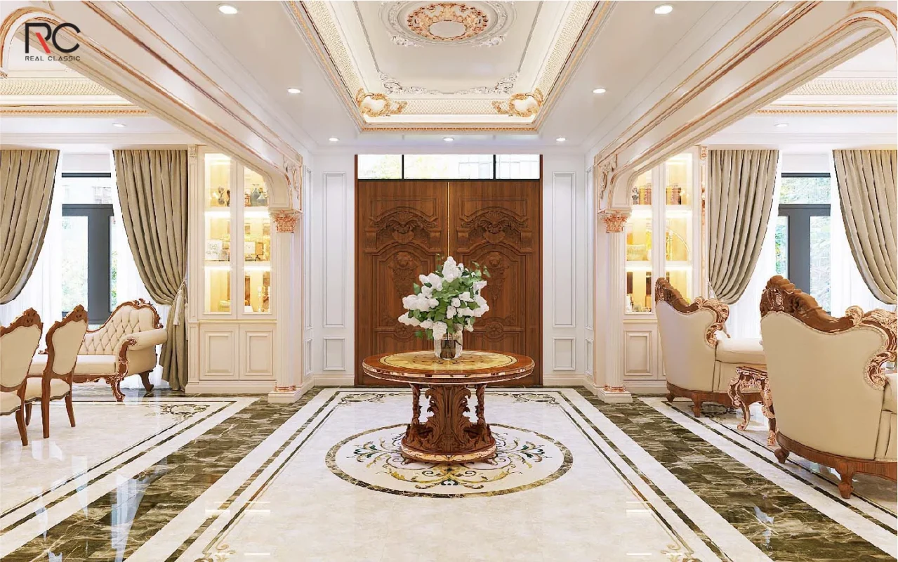 1. TỔNG QUAN DỰ ÁN 2. Nguyện vọng của gia chủ 2.1. Giải pháp của Real Classic 3. Phân tích không gian nội thất 3.1. Sảnh chính Bước vào biệt thự, sảnh lát đá marble medallion hoạ tiết đối xứng, viền đen sanh trọng. Trần cao được kẻ khe chìm LED, đèn chùm pha lê […]